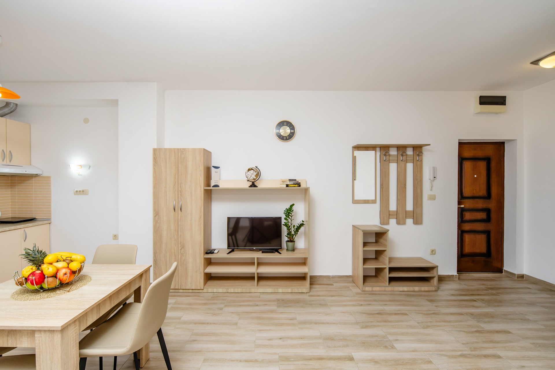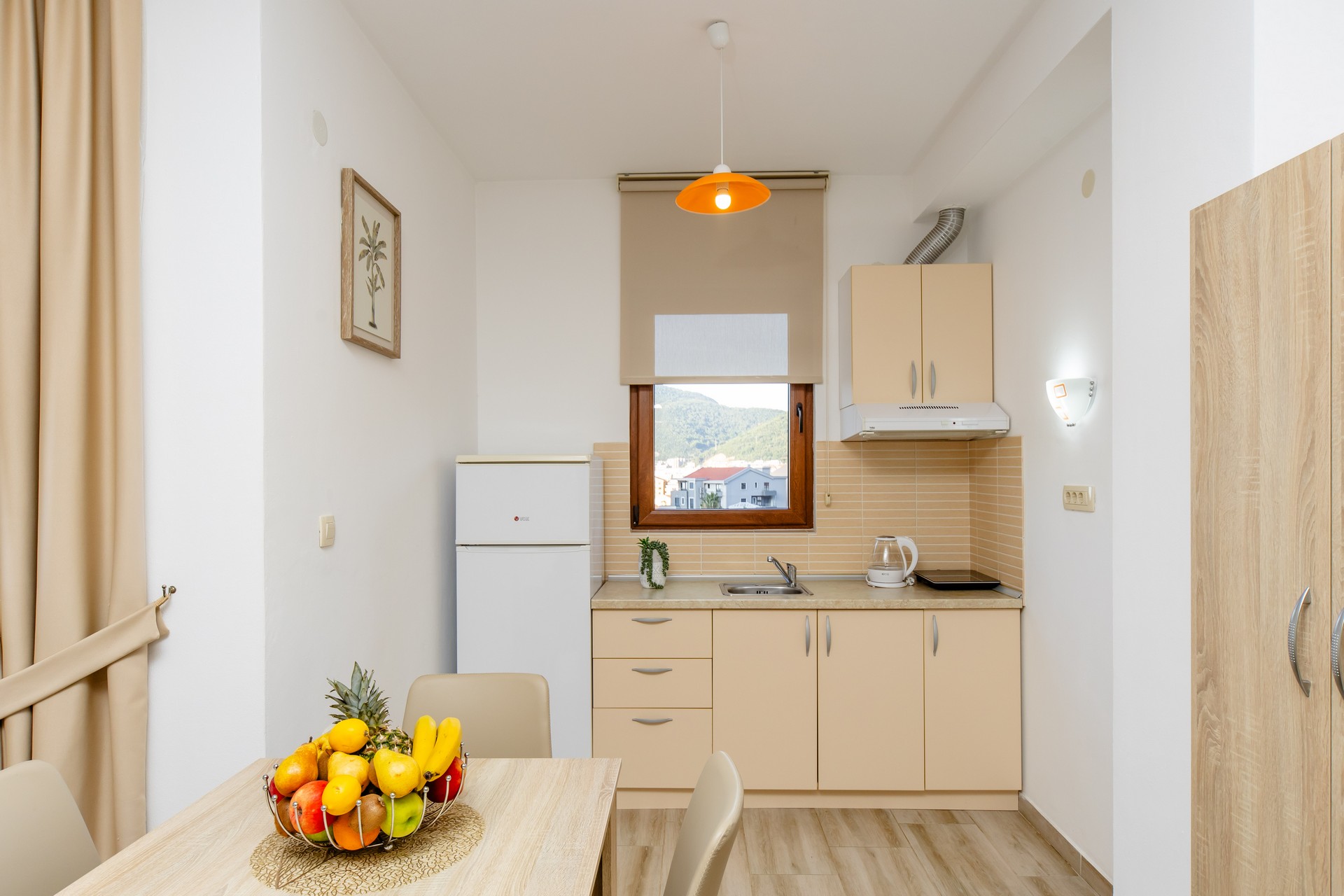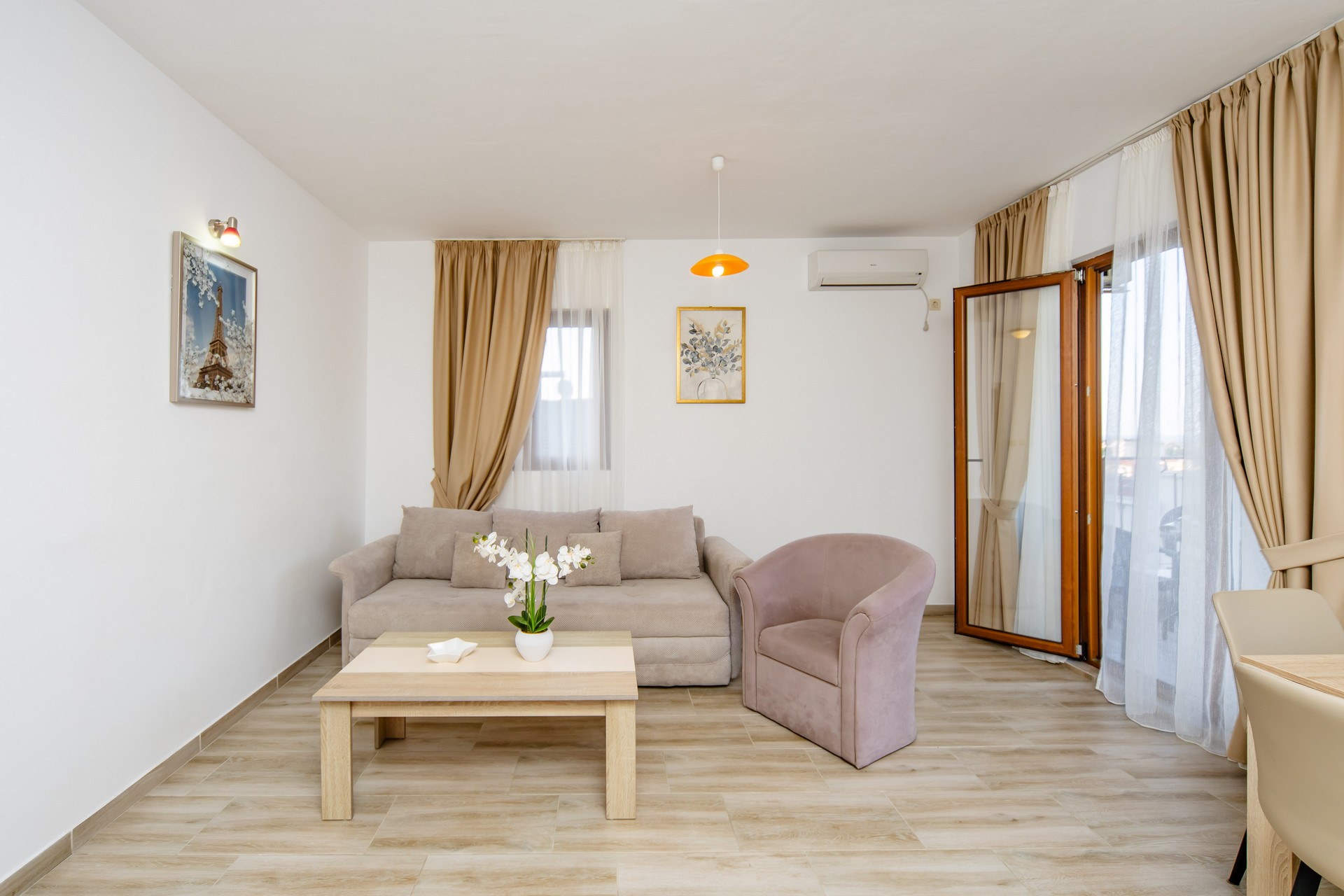 Apartman sa jednom spavaćom sobom i pogledom na more ima kapacitet za četiri osobe. Sadrži bračni krevet i sofu za dvije osobe u dnevnom boravku. Dječiji krevetić je dostupan na zahtjev. Ima potpuno opremljenu kuhinju sa stolom i stolicama, pločom za kuvanje, kuvalom za vodu, kuhinjskim priborom i frižiderom sa zamrzivačem. Kupatilo sadrži tuš, fen i mašinu za pranje veša. Apartman je klimatizovan, a gostima su na raspolaganju bežični internet, televizor sa satelitskim kanalima, pegla/daska za peglanje, sef i lift. Kvadratura: 48m2.