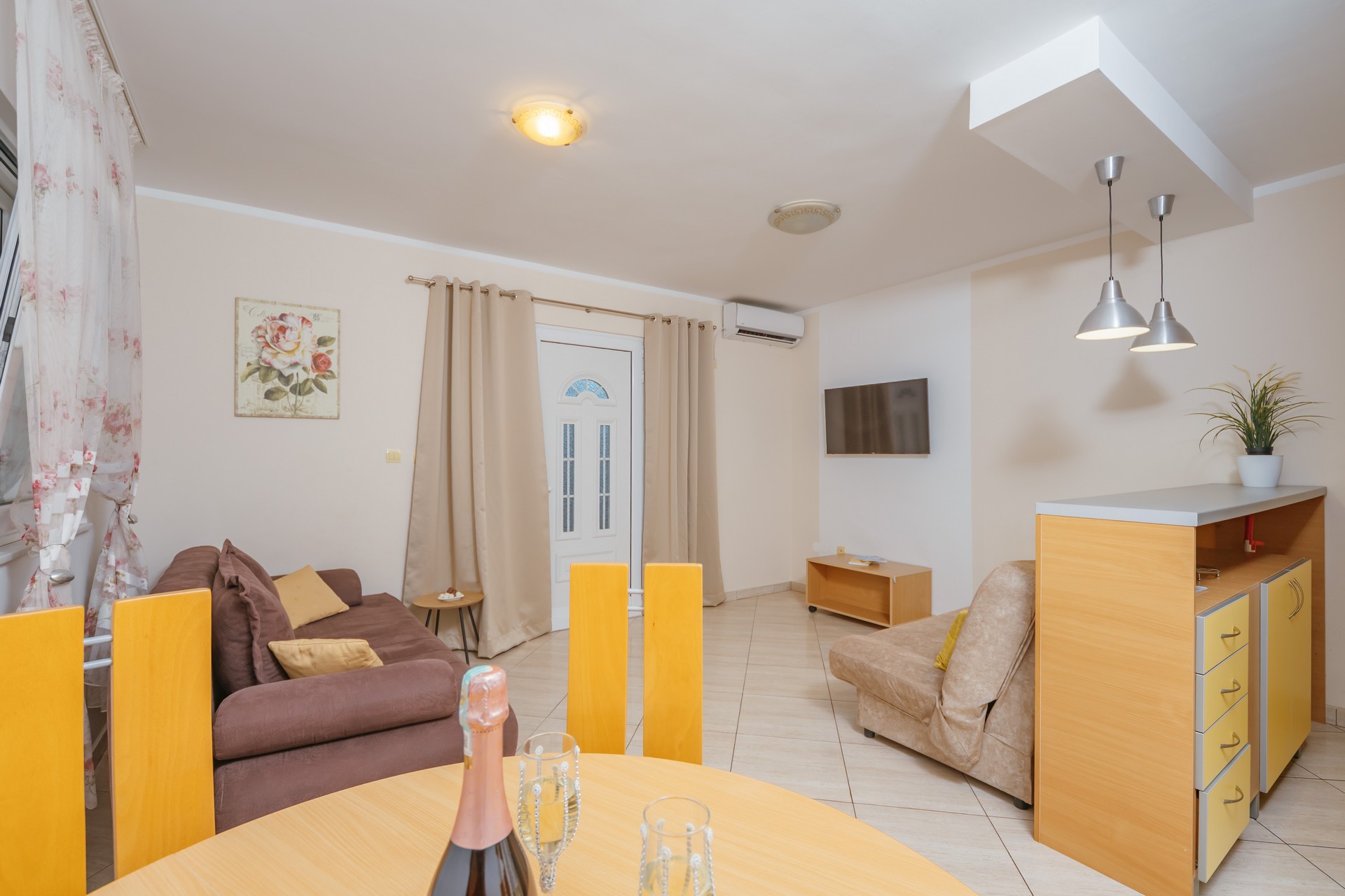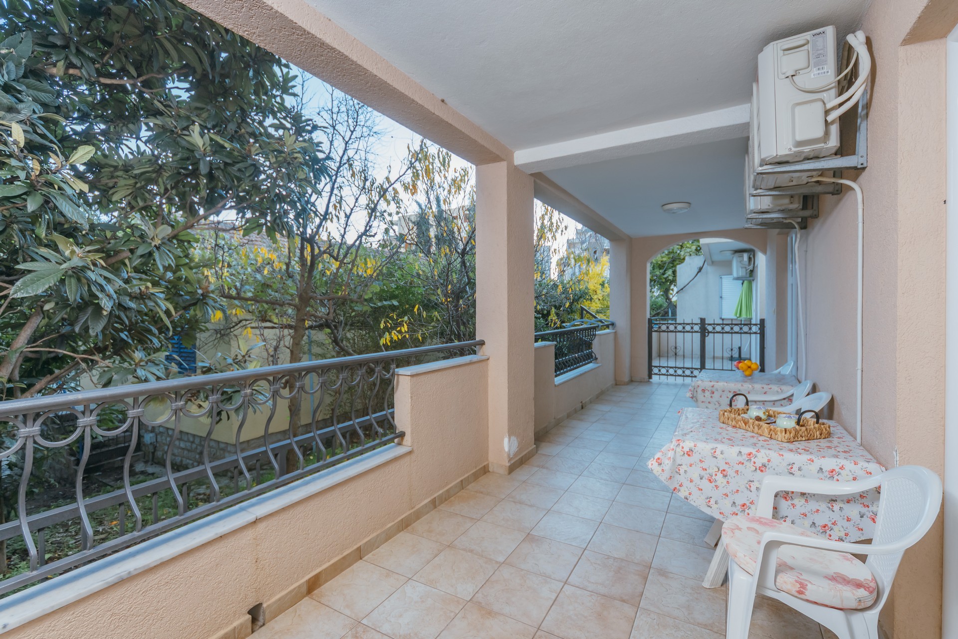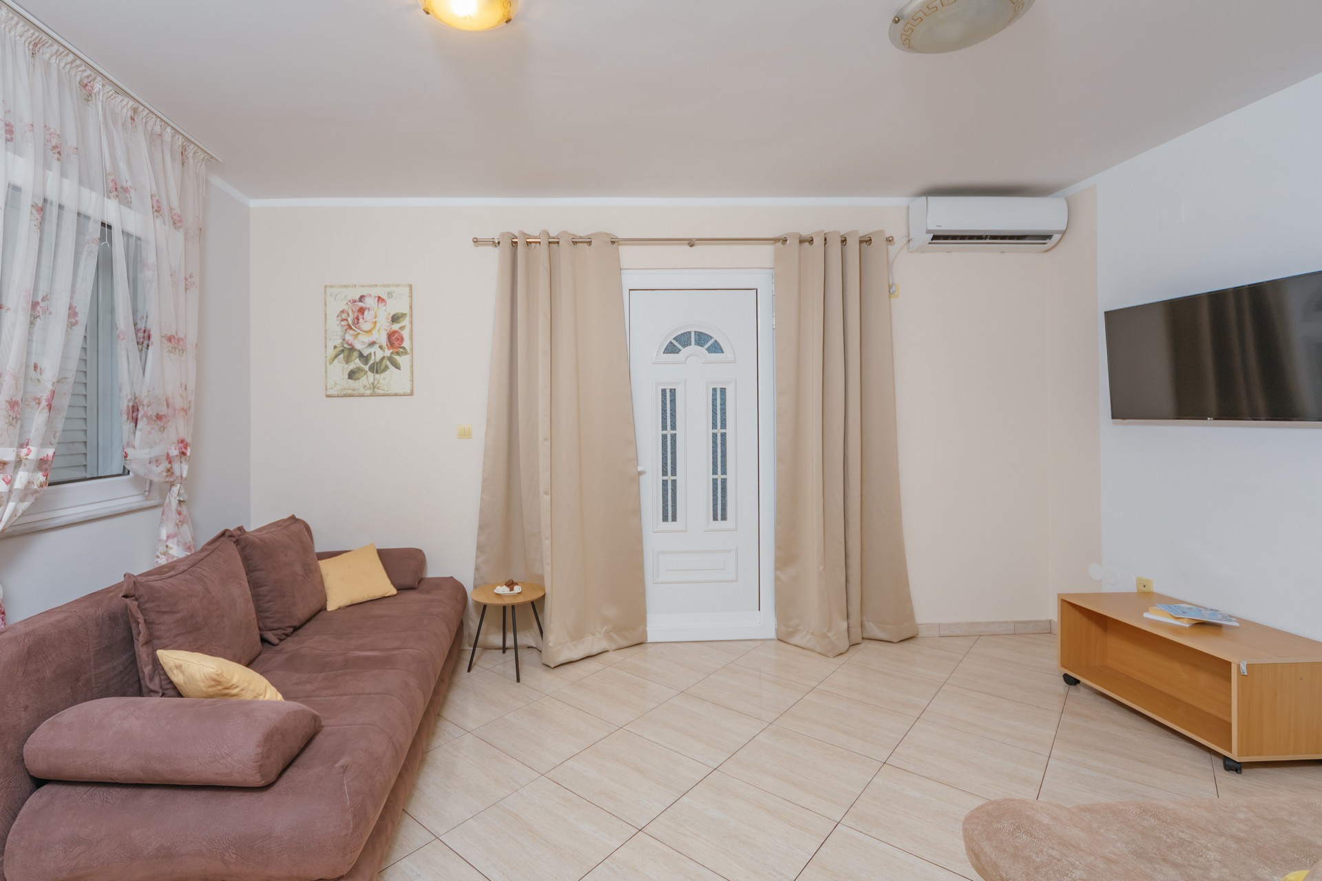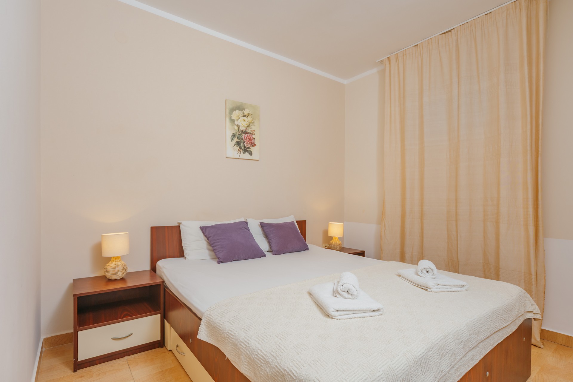Apartman sa jednom spavaćom sobom i zajedničkim balkonom je kapaciteta za četiri osobe i nalazi se u prizemlju. Sadrži sobu sa bračnim krevetom i sofu za dvije osobe u dnevnom boravku. Dva apartmana dijele jedan zajednički balkon. Kuhinja je opremljena sa stolom i stolicama, pločom za kuvanje, kuvalom za vodu, mikrotalasnom pećnicom, kafe aparatom, kuhinjskim priborom i frižiderom. U kupatilu se nalazi tuš kabina i fen za kosu. Apartman je klimatizovan, a gostima su na raspolaganju internet, TV sa kablovskim kanalima, pegla/daska za peglanje i sef. Kvadratura apartmana: 50m2. Parking je obezbijedjen za jedno vozilo po apartmanu i najava je obavezna.