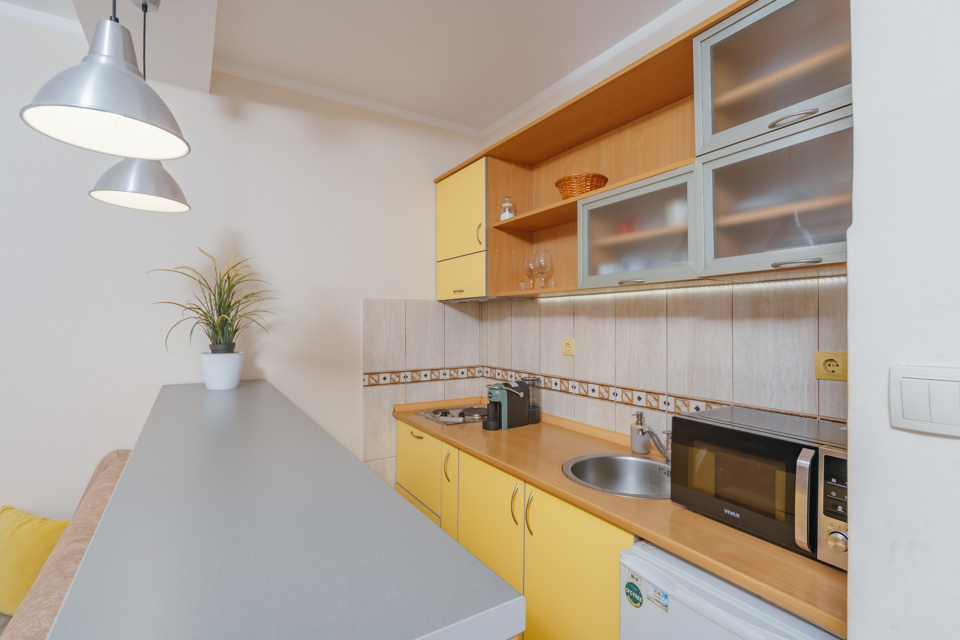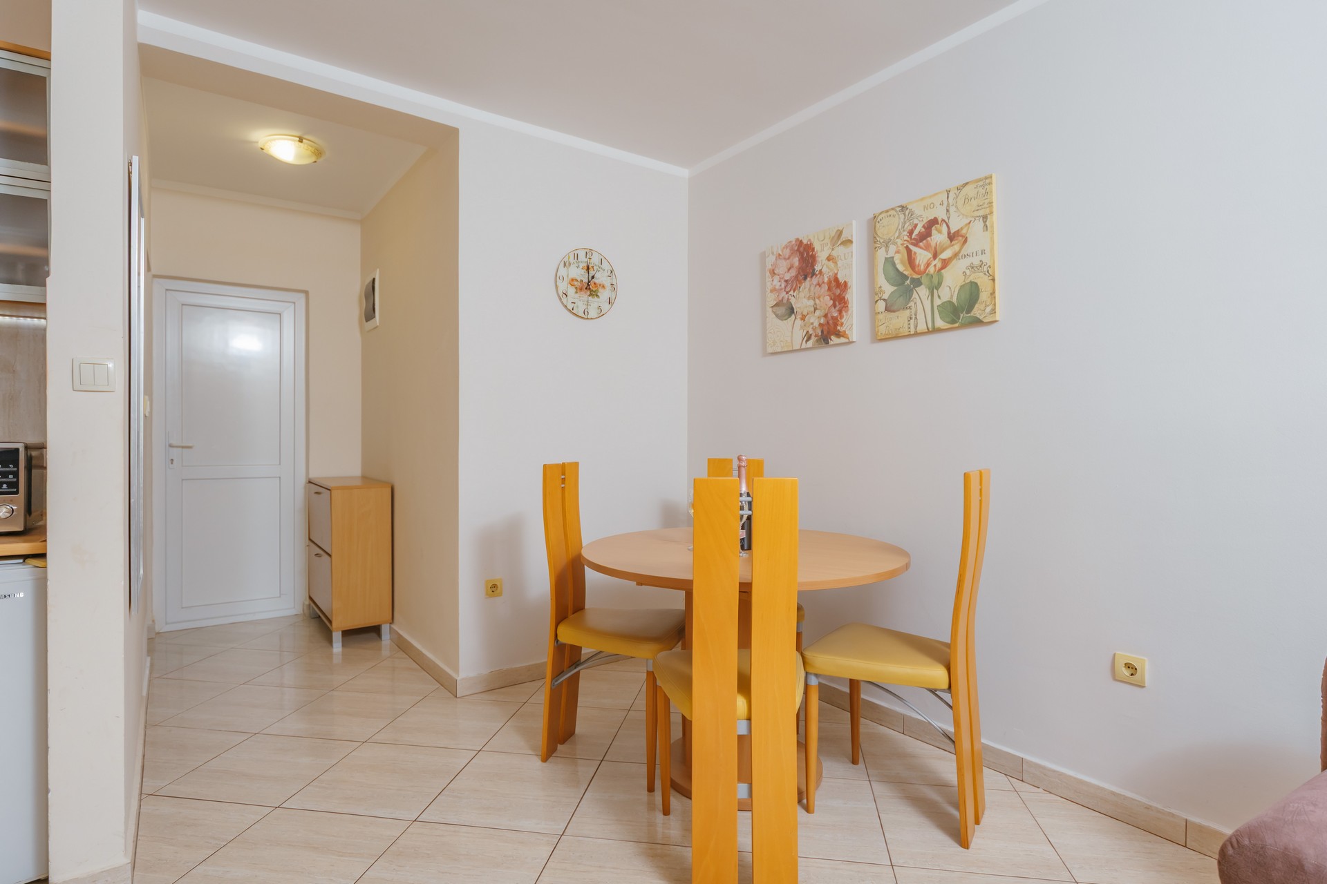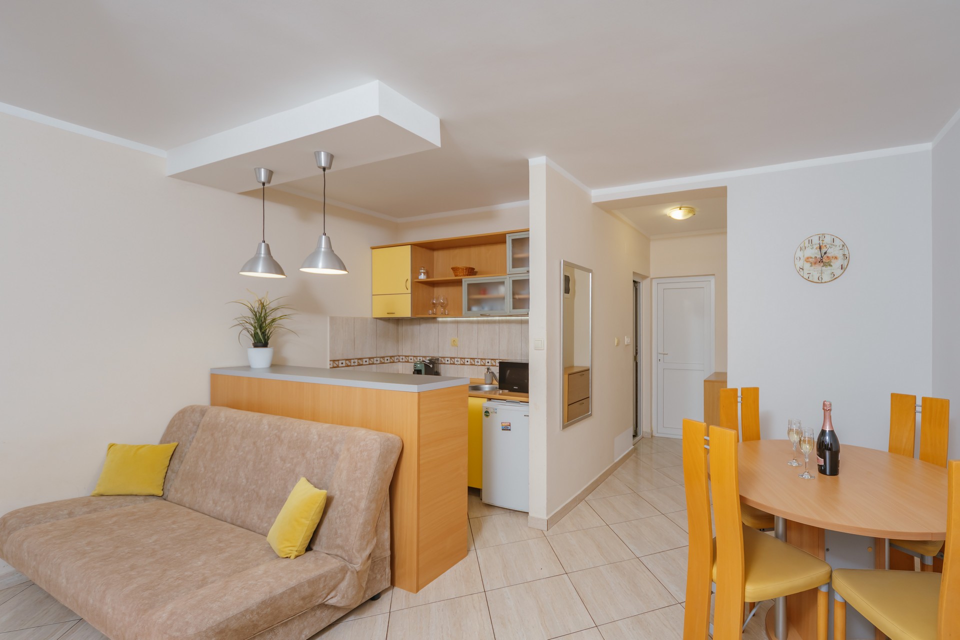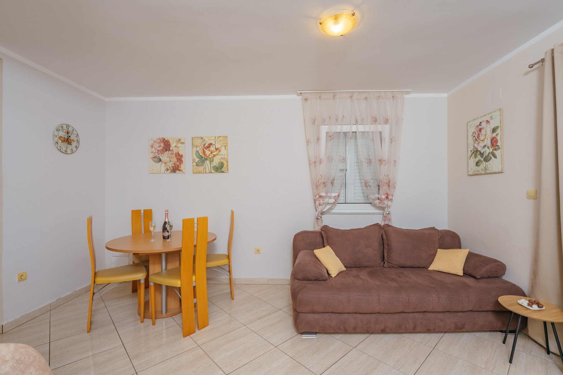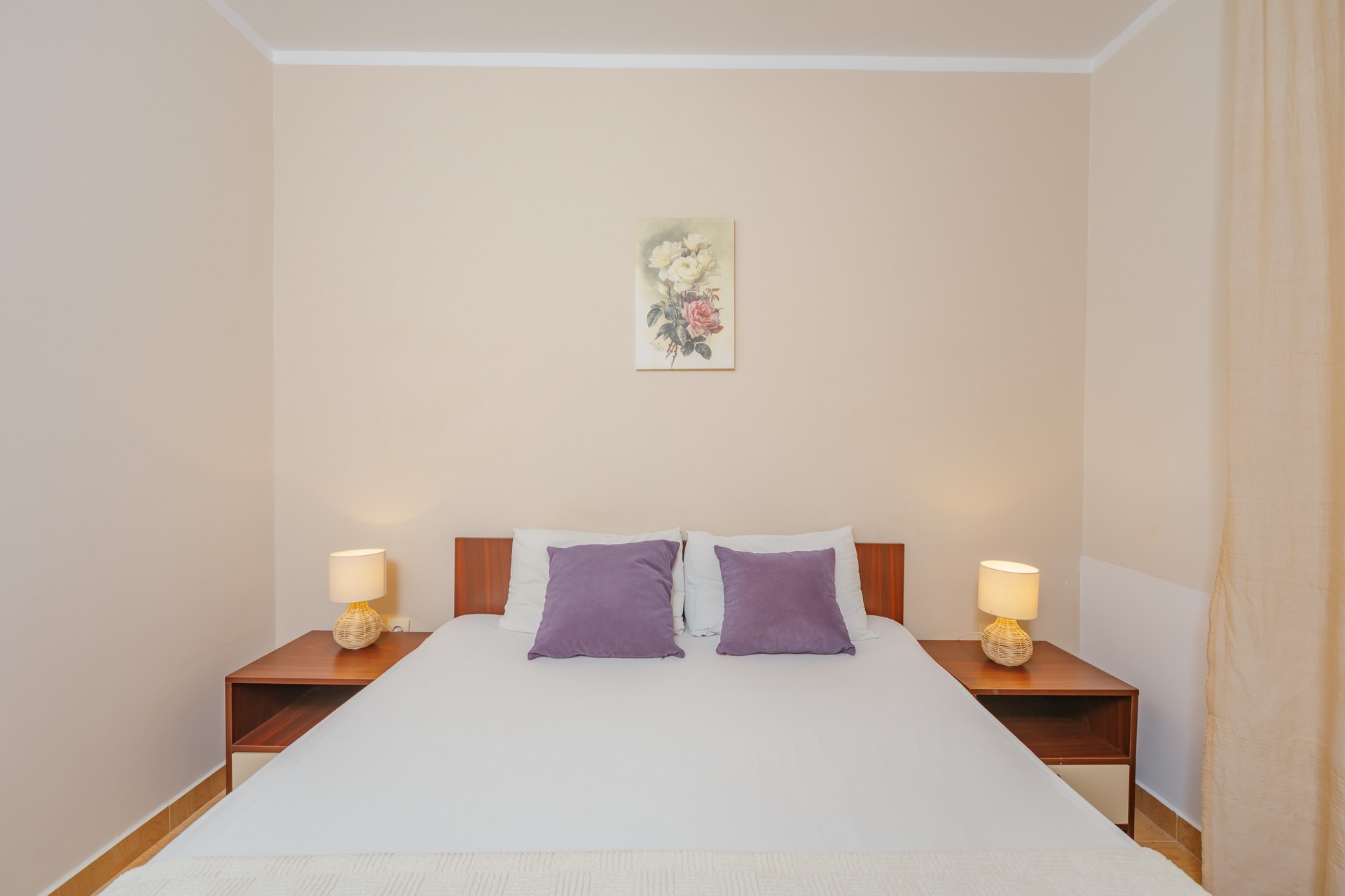 Apartman sa jednom spavaćom sobom i zajedničkim balkonom je kapaciteta za četiri osobe i nalazi se u prizemlju. Sadrži sobu sa bračnim krevetom i sofu za dvije osobe u dnevnom boravku. Dva apartmana dijele jedan zajednički balkon. Kuhinja je opremljena sa stolom i stolicama, pločom za kuvanje, kuvalom za vodu, mikrotalasnom pećnicom, kafe aparatom, kuhinjskim priborom i frižiderom. U kupatilu se nalazi tuš kabina i fen za kosu. Apartman je klimatizovan, a gostima su na raspolaganju internet, TV sa kablovskim kanalima, pegla/daska za peglanje i sef. Kvadratura apartmana: 50m2. Parking je obezbijedjen za jedno vozilo po apartmanu i najava je obavezna.
