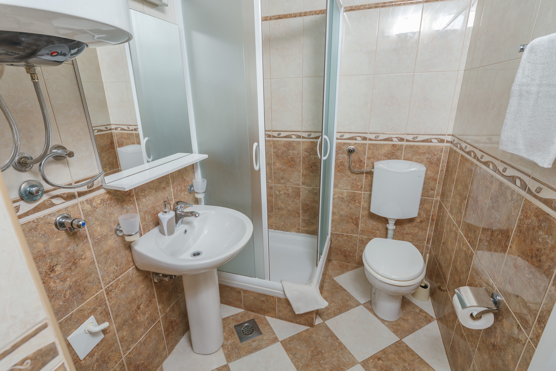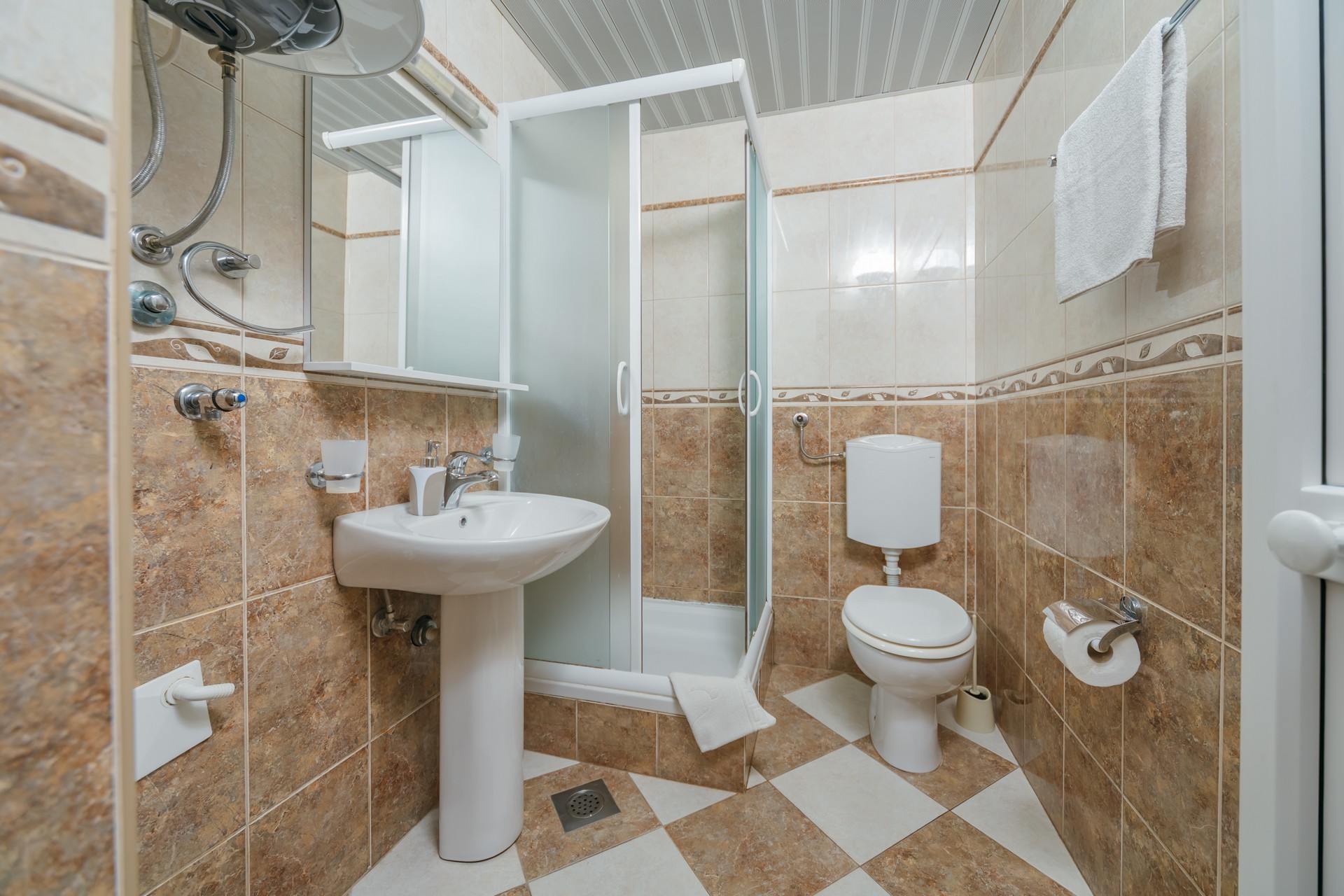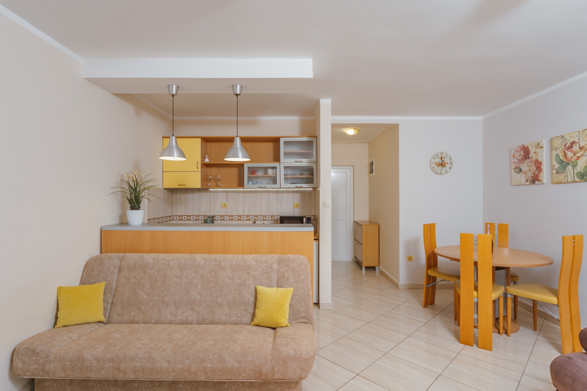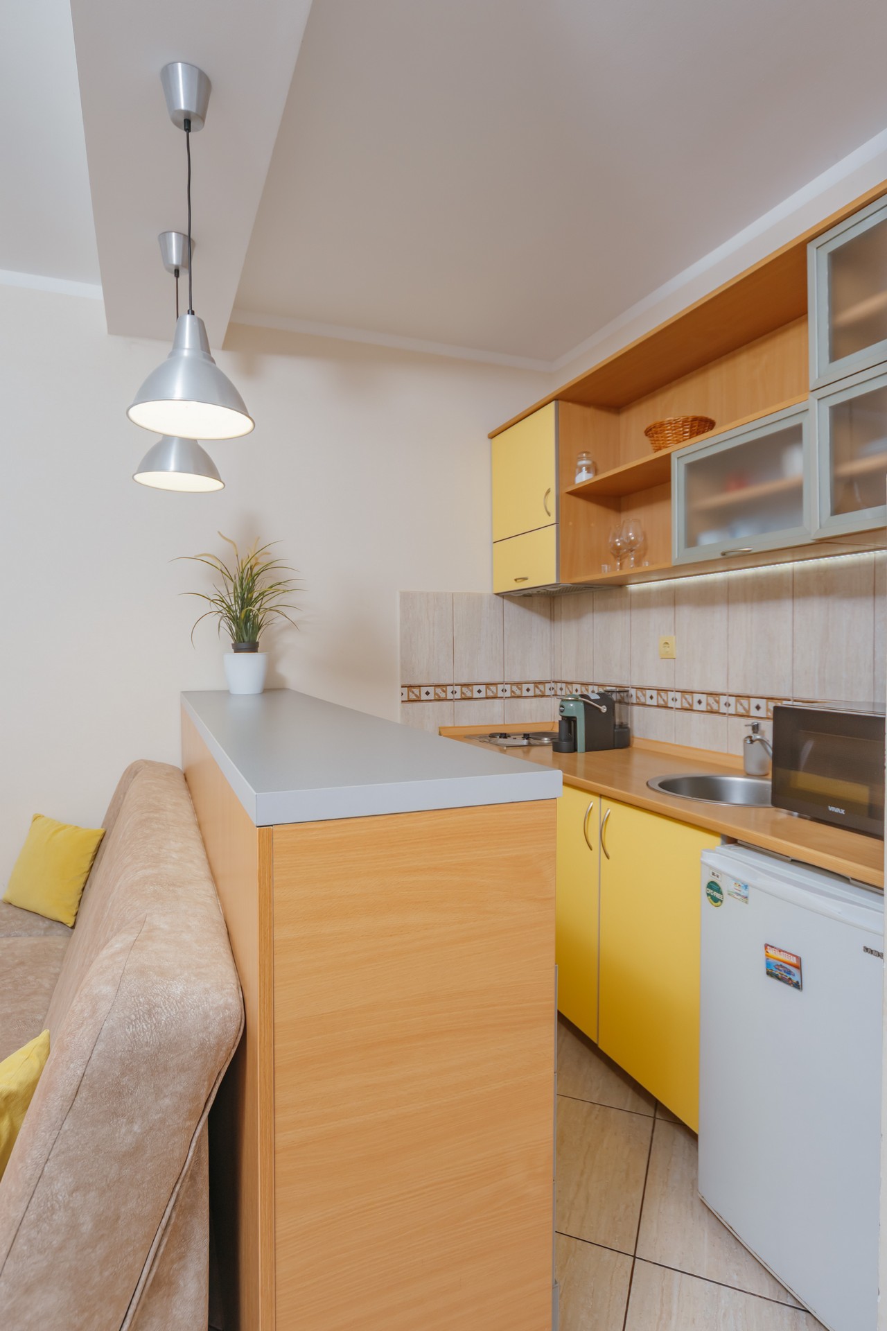 Apartman sa jednom spavaćom sobom i zajedničkim balkonom je kapaciteta za četiri osobe i nalazi se u prizemlju. Sadrži sobu sa bračnim krevetom i sofu za dvije osobe u dnevnom boravku. Dva apartmana dijele jedan zajednički balkon. Kuhinja je opremljena sa stolom i stolicama, pločom za kuvanje, kuvalom za vodu, mikrotalasnom pećnicom, kafe aparatom, kuhinjskim priborom i frižiderom. U kupatilu se nalazi tuš kabina i fen za kosu. Apartman je klimatizovan, a gostima su na raspolaganju internet, TV sa kablovskim kanalima, pegla/daska za peglanje i sef. Kvadratura apartmana: 50m2. Parking je obezbijedjen za jedno vozilo po apartmanu i najava je obavezna.