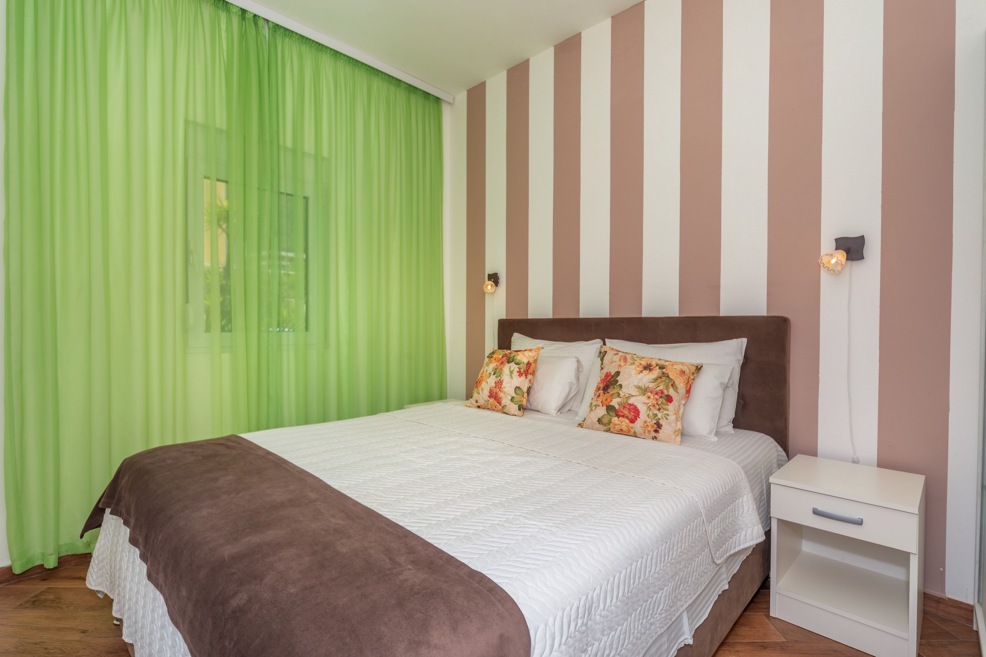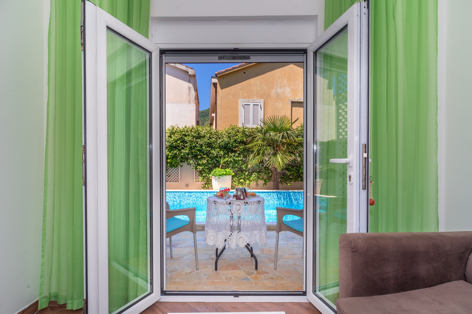Apartman sa jednom spavaćom sobom sa terasom je kapaciteta za četiri osobe. U ponudi imamo dvije smještajne jedinice. Nalaze se u prizemlju i imaju terasu koja izlazi na bazen. Jedinica sadrži spavaću sobu sa francuskim ležajem i sofu za dvije osobe u dnevnom boravku, sa mogućnošću dodatnog krevetića za djecu. Kuhinja je kompletno opremljena sa trpezarijskim stolom i stolicama, pločom za kuvanje, kuvalom za vodu, kuhinjskim priborom, i frižiderom sa malim zamrzivačom. Dječija stolica (na upit) i pegla/daska za peglanje su dostupni u smještaju. U kupatilu se nalazi tuš kabina i fen. Apartman je klimatizovan, sa dvije klime u spavaćoj sobi i dnevnom boravku, a gostima su na raspolaganju bežični internet i televizor sa kablovskim kanalima. Kvadratura: 40m2.