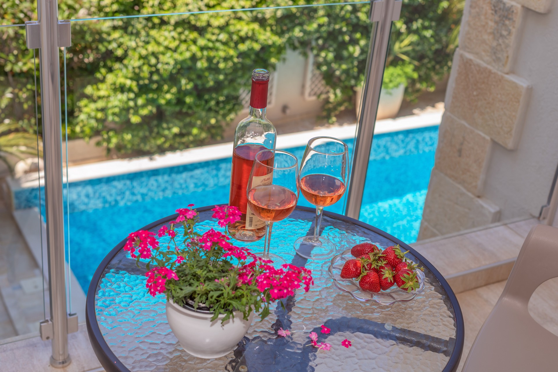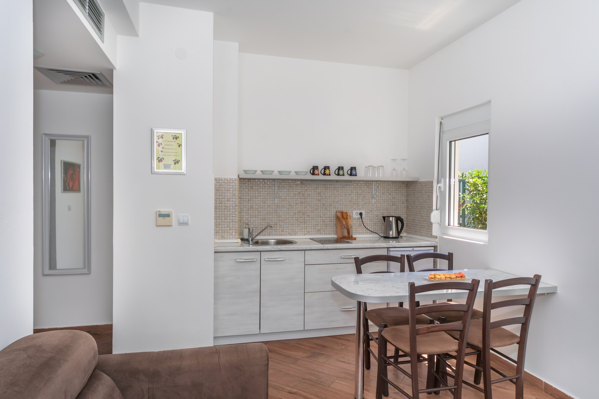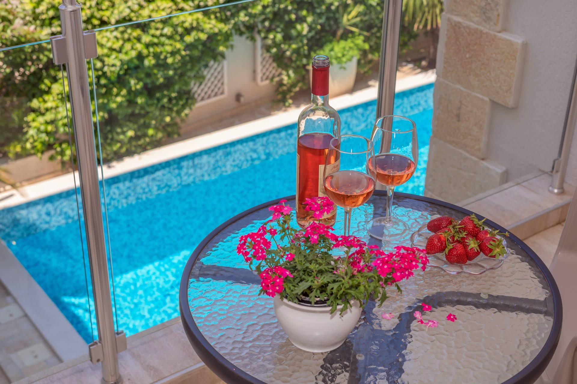 Apartman sa jednom spavaćom sobom sa balkonom je kapaciteta za četiri osobe. U ponudi imamo četiri smještajne jedinice. Nalaze se na prvom i drugom spratu i sve imaju balkone sa pogledom na bazen. Jedinica sadrži spavaću sobu sa francuskim ležajem i sofu za dvije osobe u dnevnom boravku, sa mogućnošću dodatnog krevetića za djecu. Kuhinja je kompletno opremljena sa trpezarijskim stolom i stolicama, pločom za kuvanje, kuvalom za vodu, kuhinjskim priborom, i frižiderom sa malim zamrzivačom. Dječija stolica (na upit) i pegla/daska za peglanje su dostupni u smještaju. U kupatilu se nalazi tuš kabina i fen. Apartman je klimatizovan, sa dvije klime u spavaćoj sobi i dnevnom boravku, a gostima su na raspolaganju bežični internet i televizor sa kablovskim kanalima. Kvadratura: 40m2.