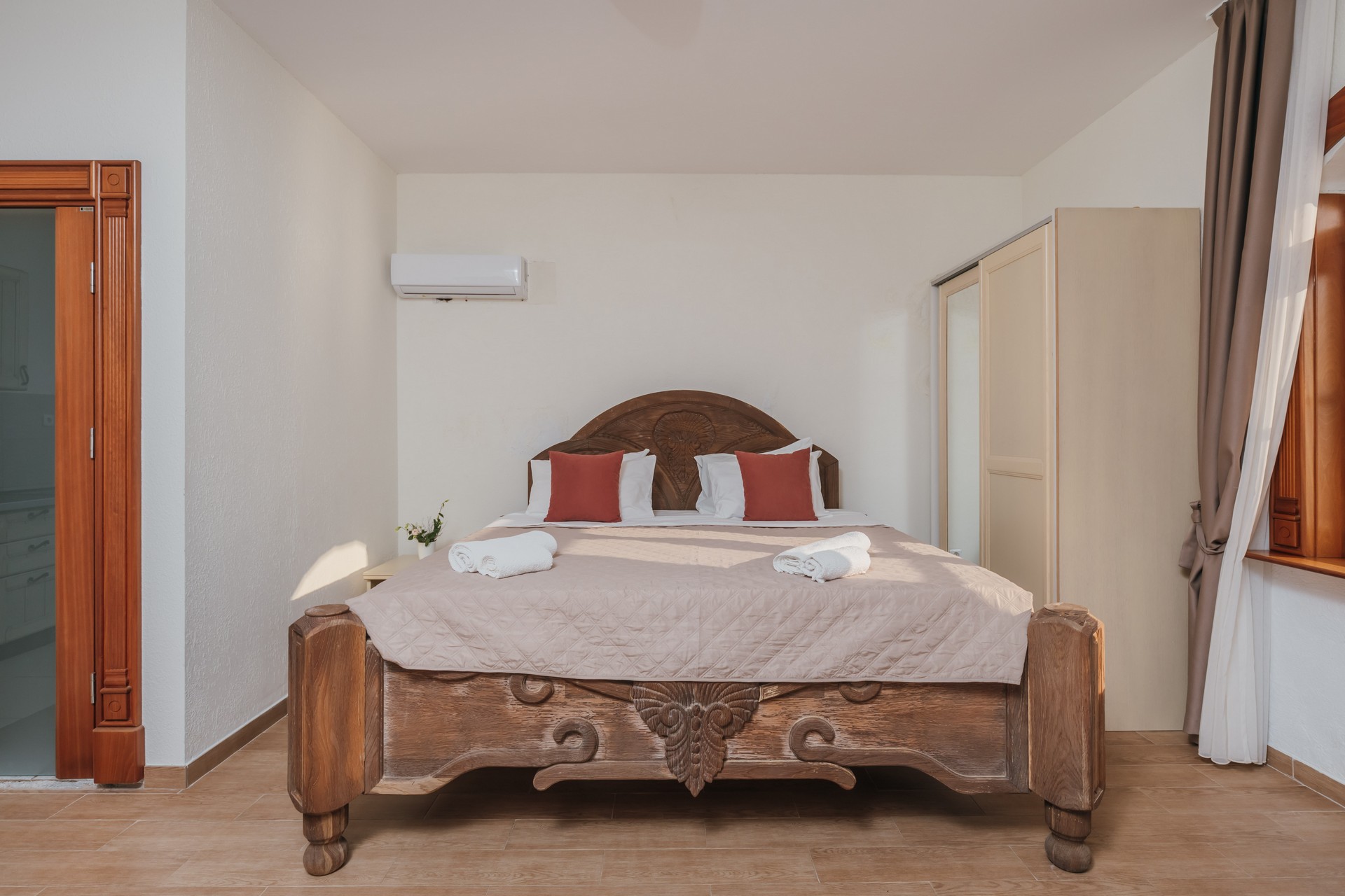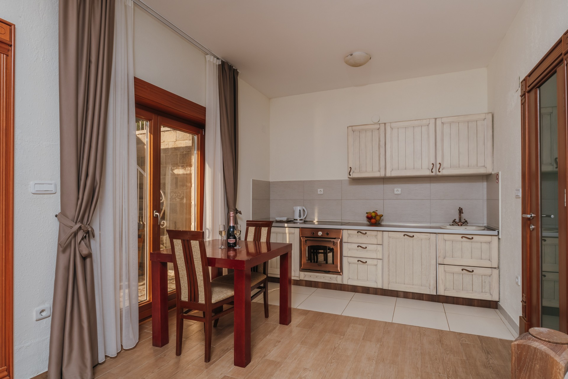 Dvokrevetni studio je kapaciteta za dvije osobe. Nalazi se na posljednjem četvrtom spratu. Gostima je na raspolaganju zajednički balkon sa pogledom na more. Sadrži bračni krevet, trpezariju, kuhinju opremljenu sa pločom za kuvanje, rernom, kuvalom za vodu, kuhinjskim priborom i frižiderom. Dječija stolica (uz nadoplatu) i pegla / daska za peglanje dostupni su na zahtjev. U kupatilu se nalazi tuš kabina i fen za kosu. Studio je klimatizovan, a gostima su na raspolaganju bežični internet i televizor sa satelitskim kanalima. Kvadratura: 30m2.