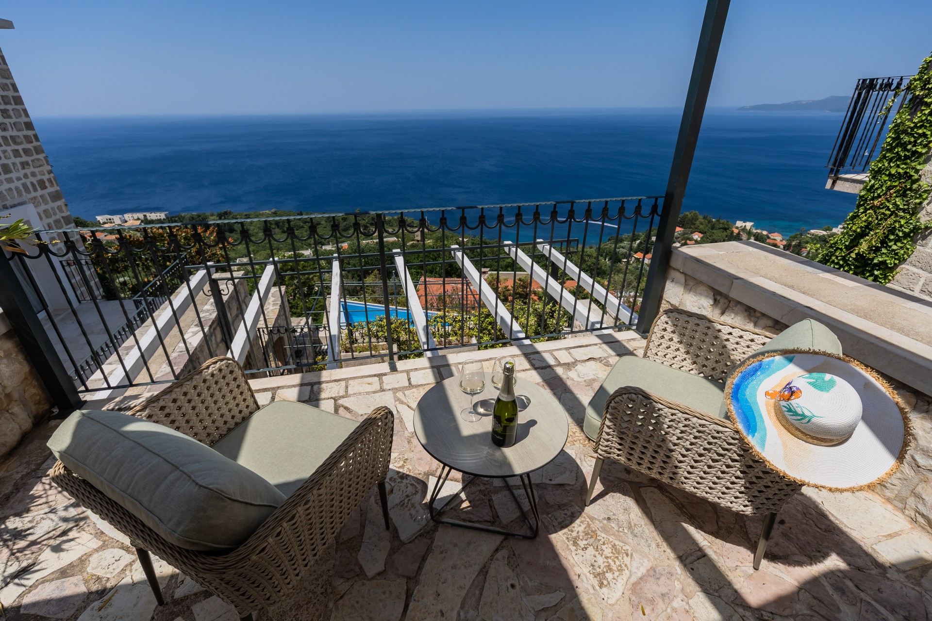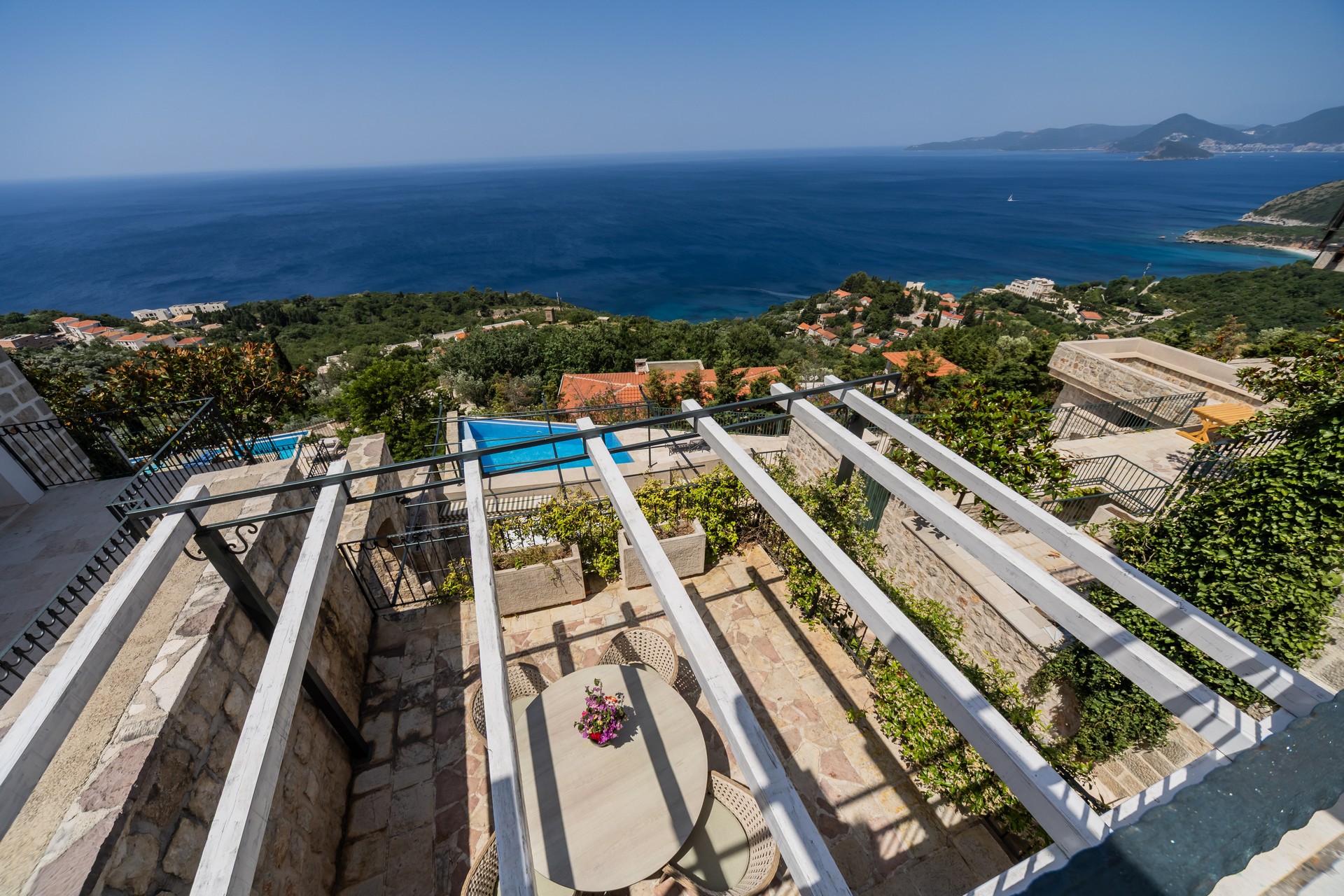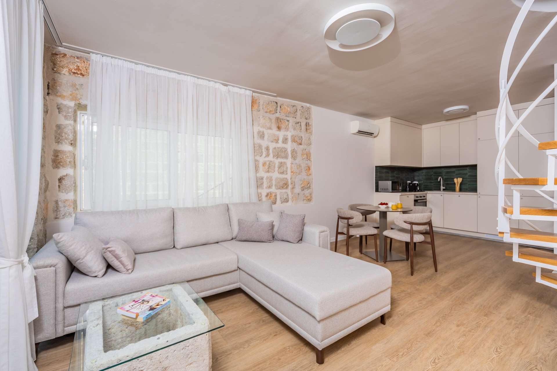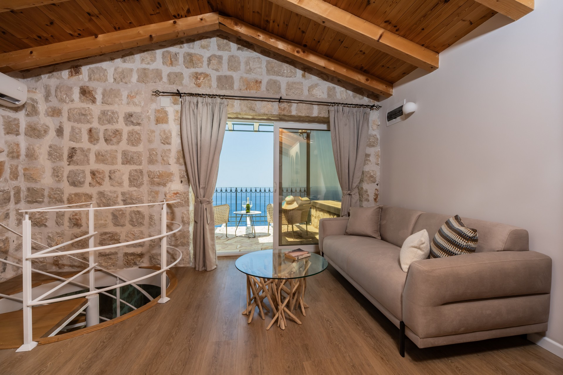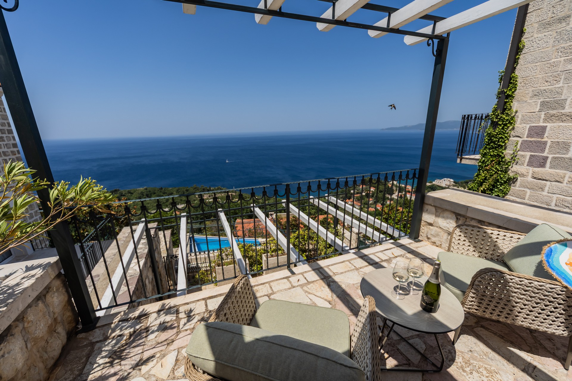 Dupleks apartman je kapaciteta za četiri osobe. Nalazi se na dva nivoa na četvrtom i petom spratu, koja imaju balkone sa predivnim pogledom na more. Prvi nivo je povezan sa drugim unutrašnjim stepenicama. Na prvom nivou se nalazi kuhinja sa trpezarijom i dnevna soba sa sofom na razvlačenje. Na drugom nivou se nalazi francuski ležaj i sofa za sjedenje. Oba nivoa posjeduju wc sa tuš kabinom. Gostima su na raspolaganju zajednički bazen sa ležaljkama i privatni parking. Kuhinja je opremljena sa stolom i stolicama, pločom za kuvanje, kuvalom za vodu, rernom ,kuhinjskim priborom, frižiderom sa zamrzivačem, tosterom, mikrotalasnom pećnicom, kafe aparatom i mašinom za sudje. Gostima su dostupni kupatilo sa tuš kabinom, mašina za pranje veša, fen za kosu, pegla i daska za peglanje. Dupleks je klimatizovan, a gosti imaju pristup bežičnom internetu i televizoru sa kablovskim kanalima. A la carte restoran je dostupan svim gostima rezorta uz rezervaciju. Kvadratura: 95m2