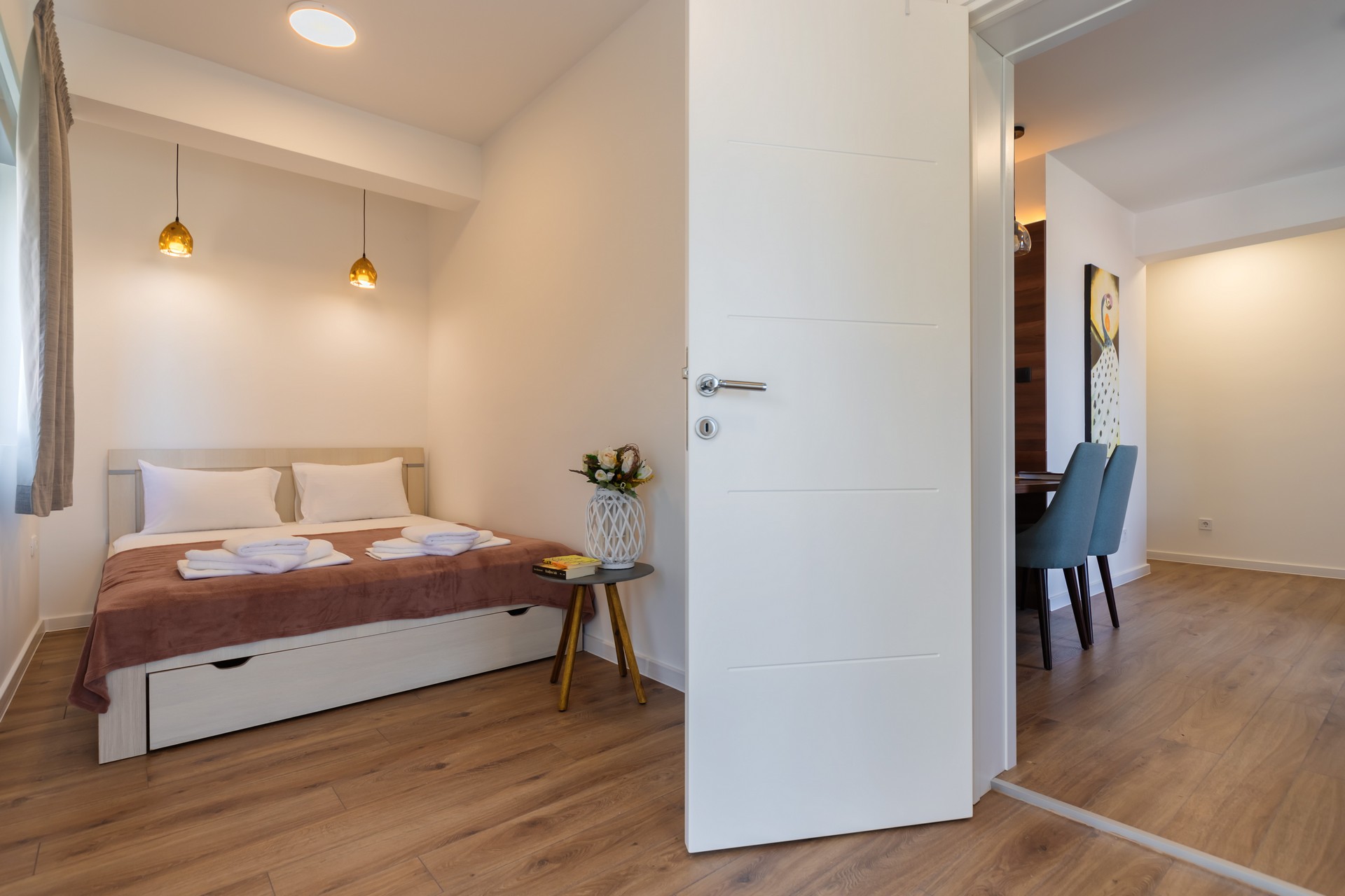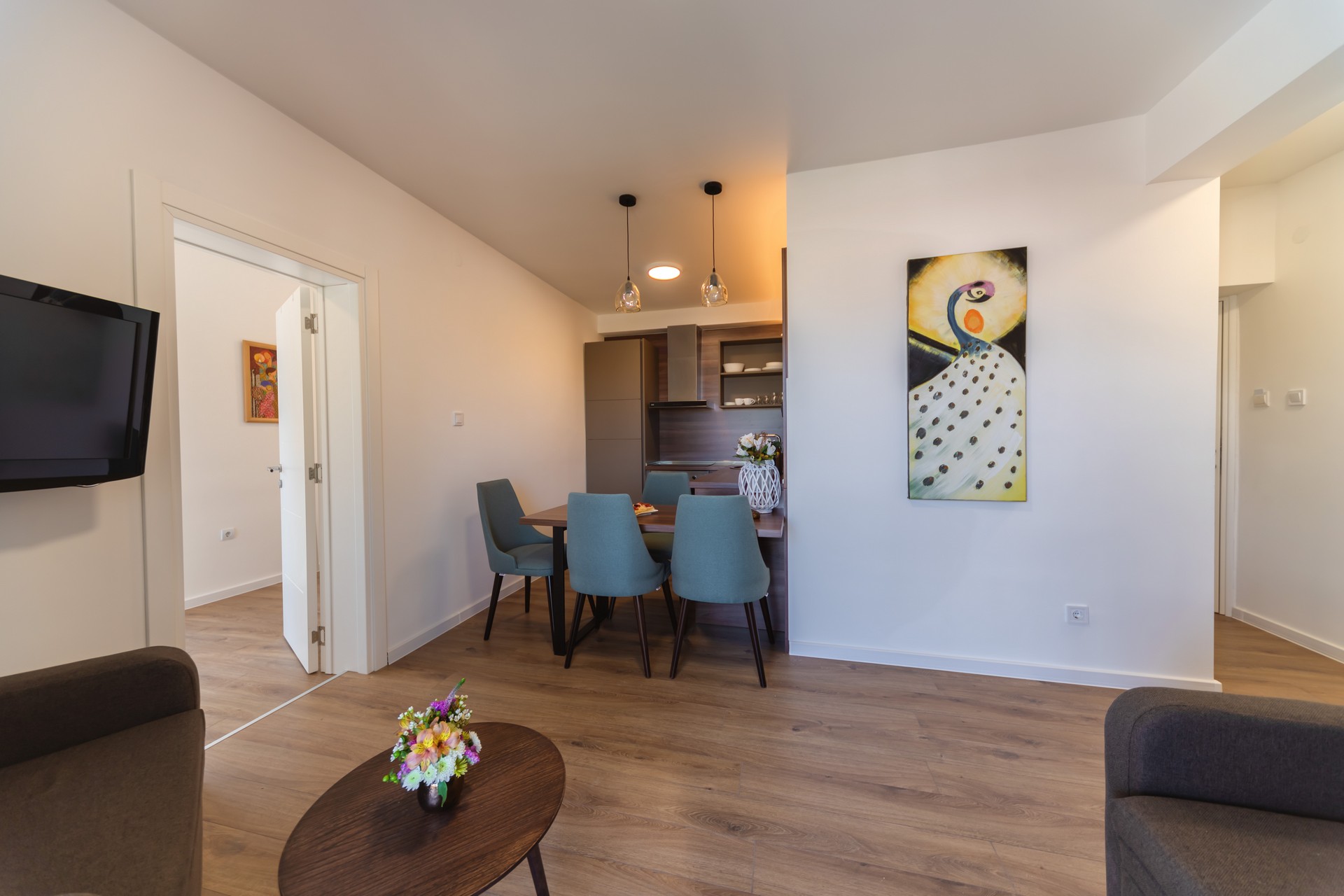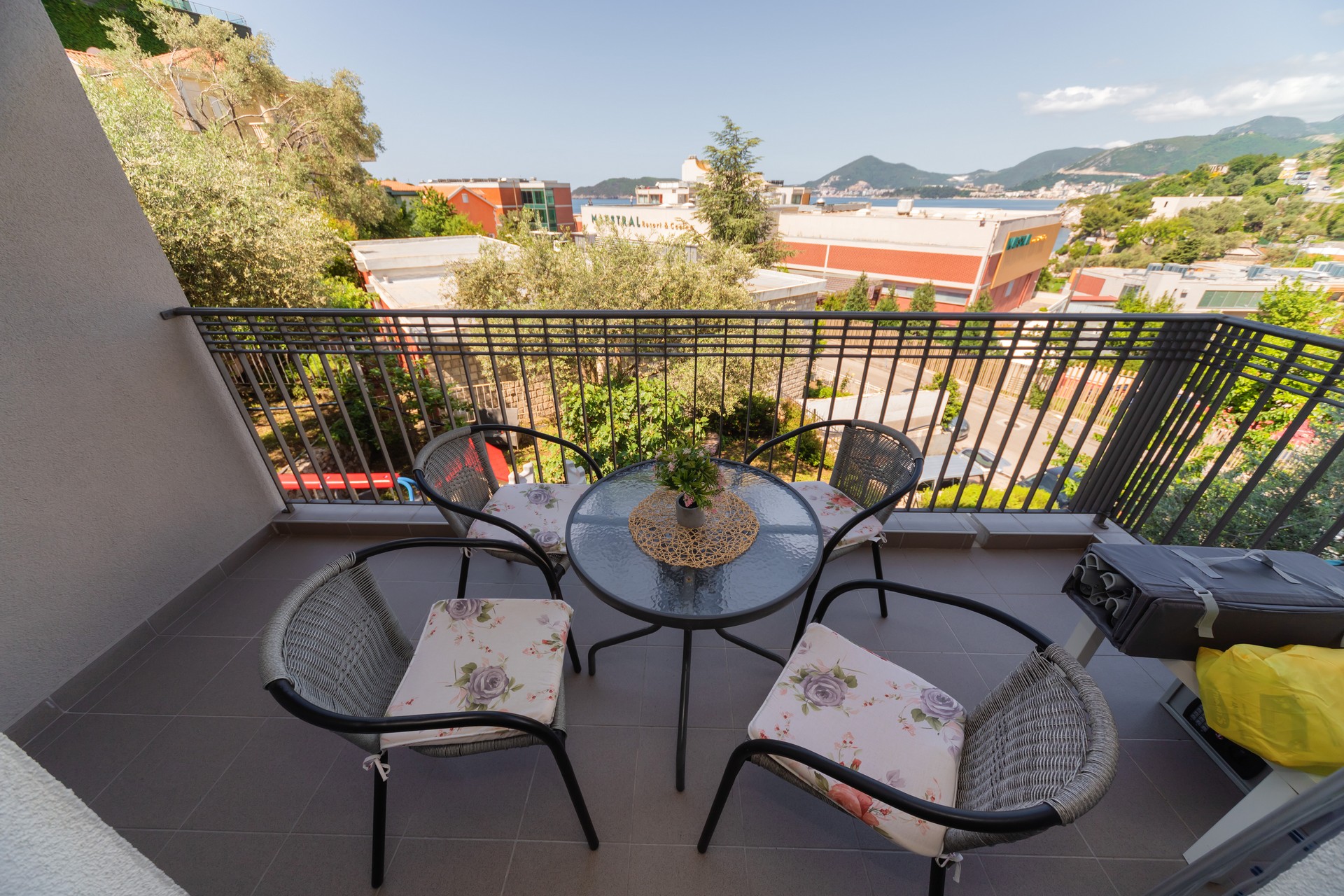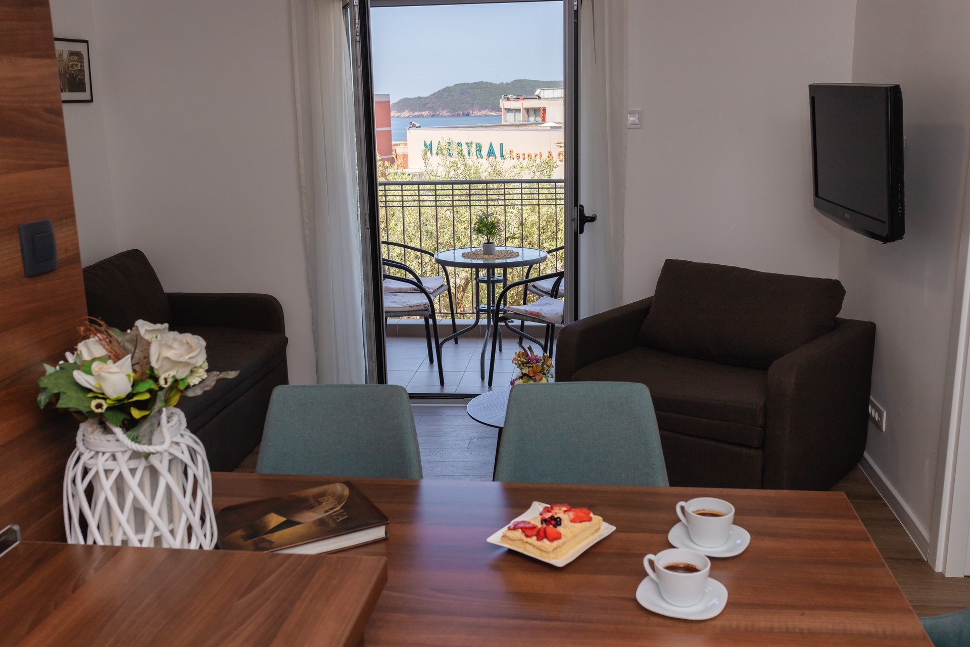 Apartman sa dvije spavaće sobe je kapaciteta za četiri osobe, uz mogućnost pomoćnog kreveta za dijete do 12 godina. Nalazi se na prvom spratu. Sa balkona se pruža predivan pogled na more. Sadrži francuski ležaj u jednoj sobi i dva odvojena ležaja koja se mogu spajati u drugoj sobi, a u dnevnom boravku je sofa za sjedenje. Kuhinja je kompletno opremljena sa trpezarijskim stolom i stolicama, pločom za kuvanje, rernom, kuvalom za vodu, kuhinjskim priborom, frižiderom i mašinom za sudje. Dječija stolica (uz doplatu) i pegla/daska za peglanje su dostupni na upit. U kupatilu se nalazi tuš kabina, fen i veš mašina. Apartman je klimatizovan, sa dvije klime (u spavaćoj sobi i u dnevnom boravku), a gostima su na raspolaganju bežični internet i televizor sa kablovskim kanalima. Kvadratura: 60m2.
