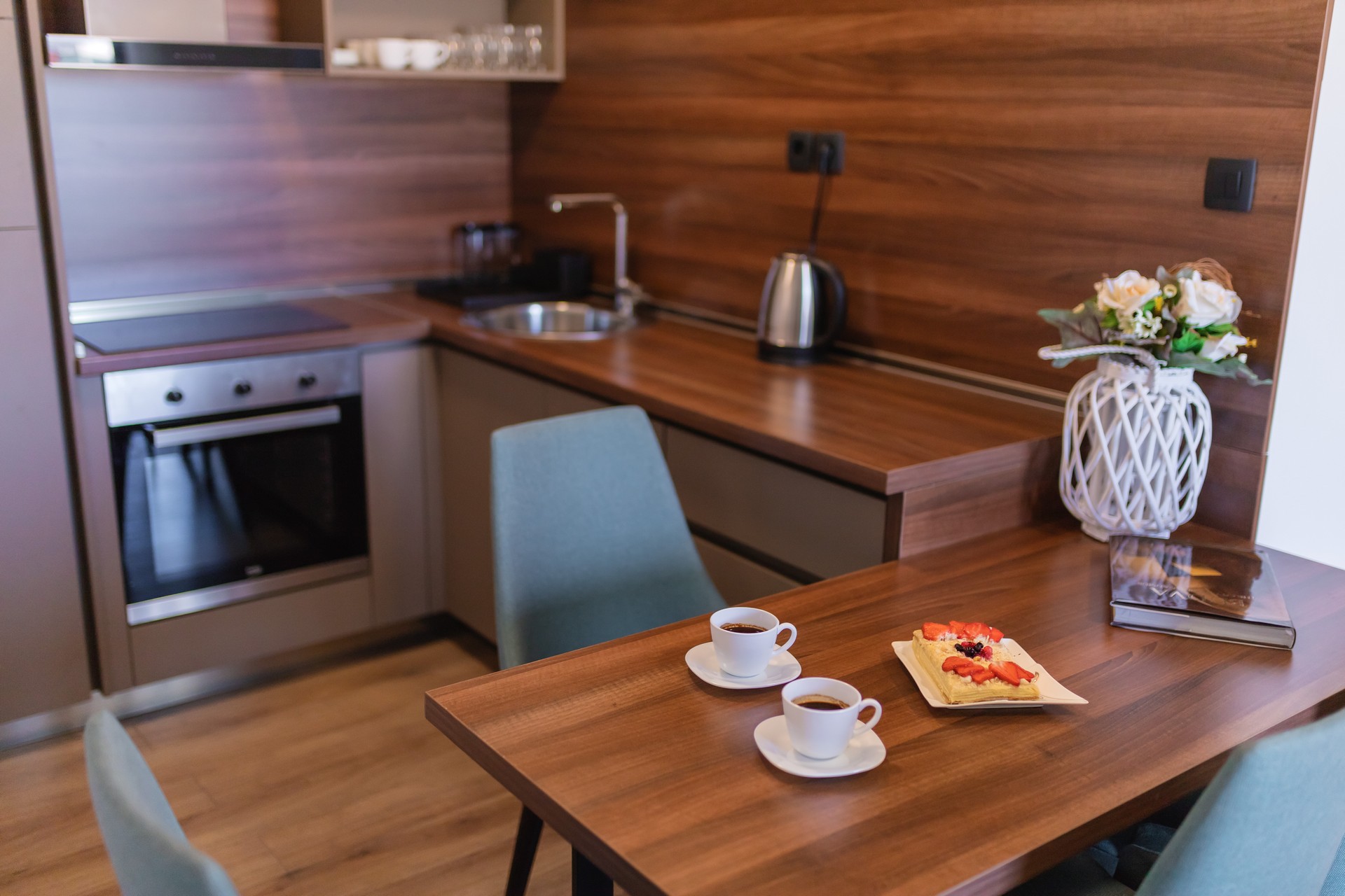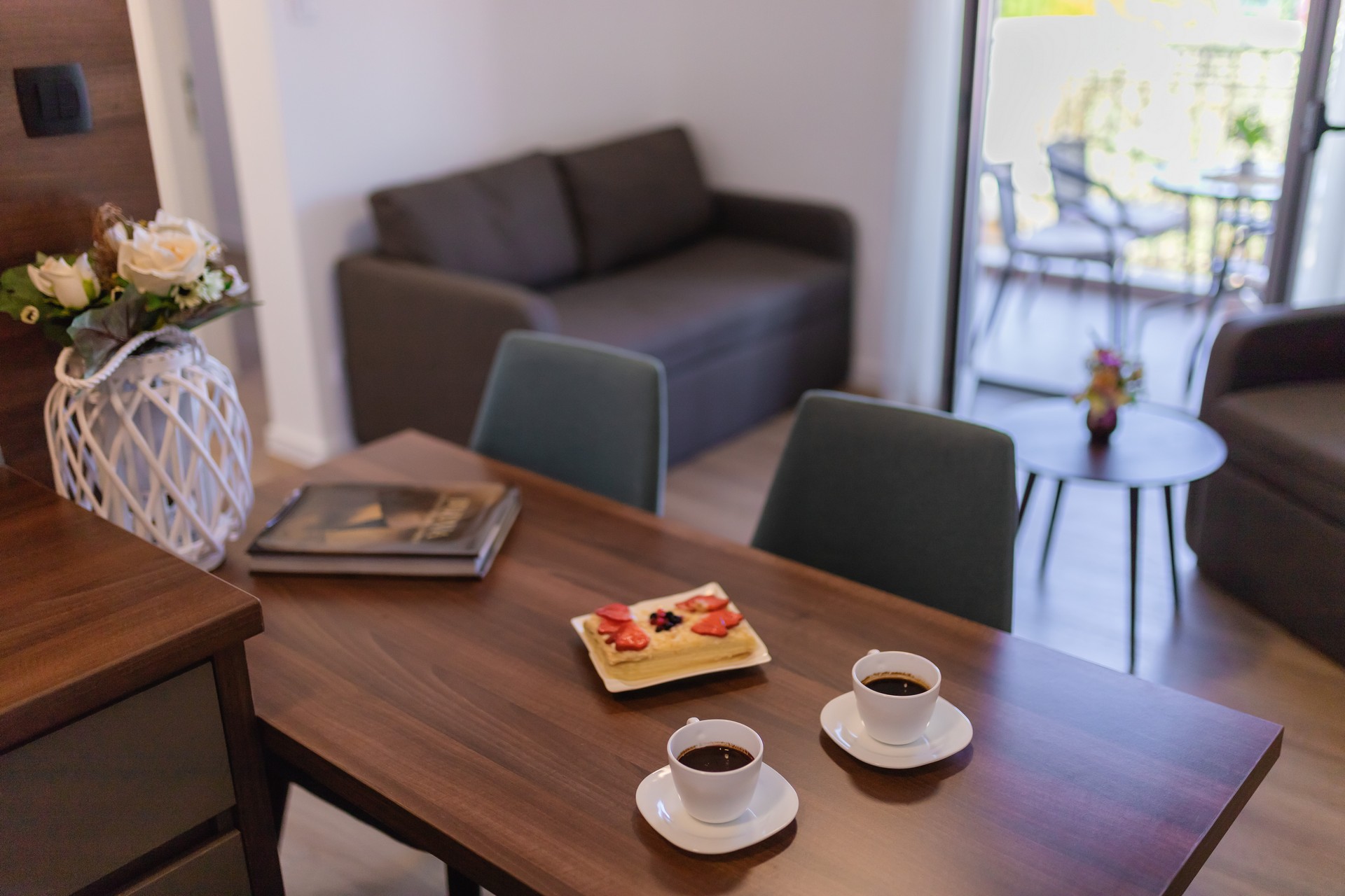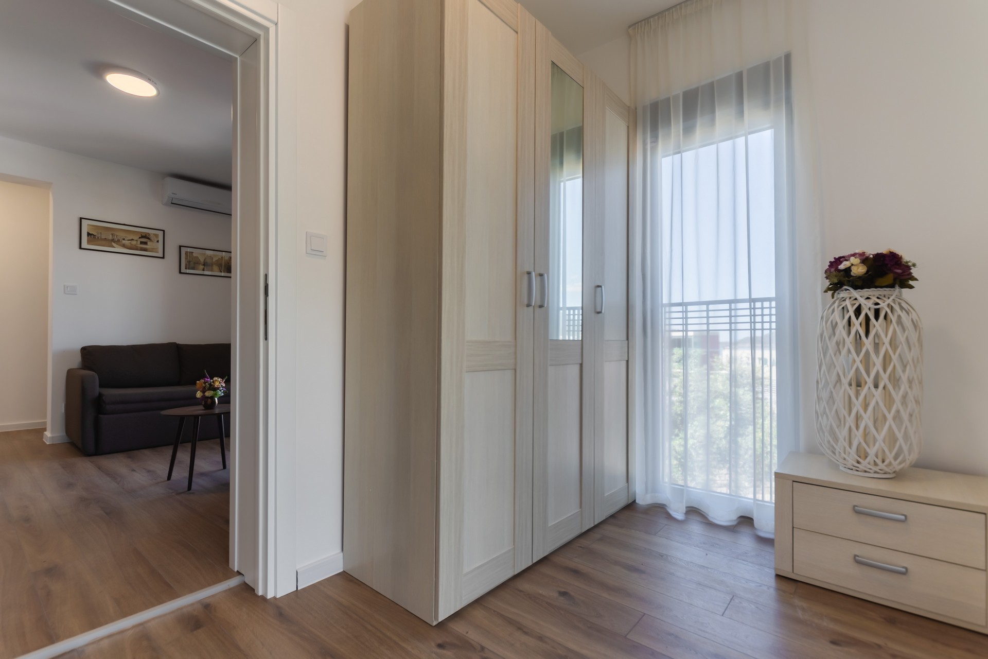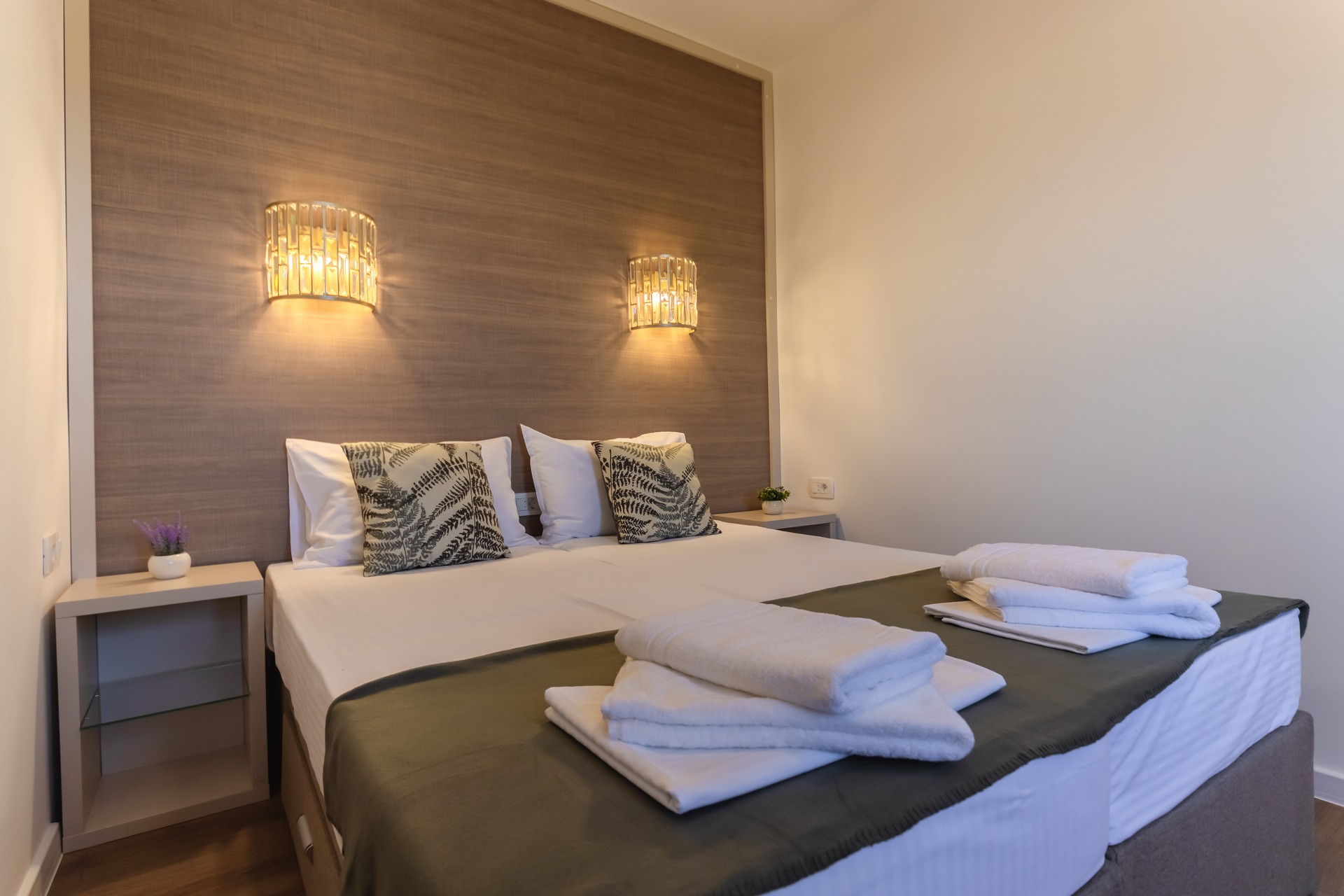 Apartman sa dvije spavaće sobe je kapaciteta za četiri osobe, uz mogućnost pomoćnog kreveta za dijete do 12 godina. Nalazi se na prvom spratu. Sa balkona se pruža predivan pogled na more. Sadrži francuski ležaj u jednoj sobi i dva odvojena ležaja koja se mogu spajati u drugoj sobi, a u dnevnom boravku je sofa za sjedenje. Kuhinja je kompletno opremljena sa trpezarijskim stolom i stolicama, pločom za kuvanje, rernom, kuvalom za vodu, kuhinjskim priborom, frižiderom i mašinom za sudje. Dječija stolica (uz doplatu) i pegla/daska za peglanje su dostupni na upit. U kupatilu se nalazi tuš kabina, fen i veš mašina. Apartman je klimatizovan, sa dvije klime (u spavaćoj sobi i u dnevnom boravku), a gostima su na raspolaganju bežični internet i televizor sa kablovskim kanalima. Kvadratura: 60m2.