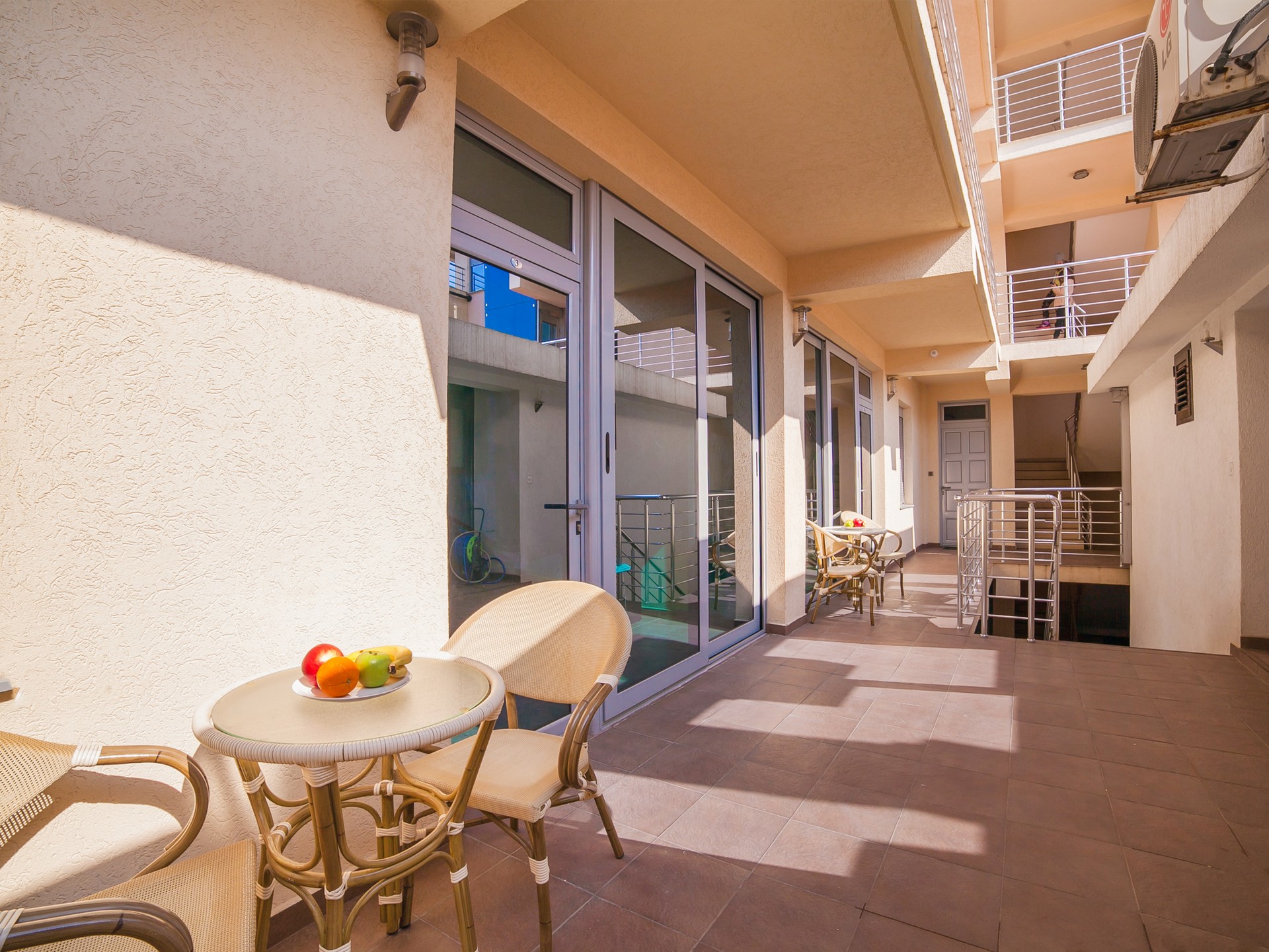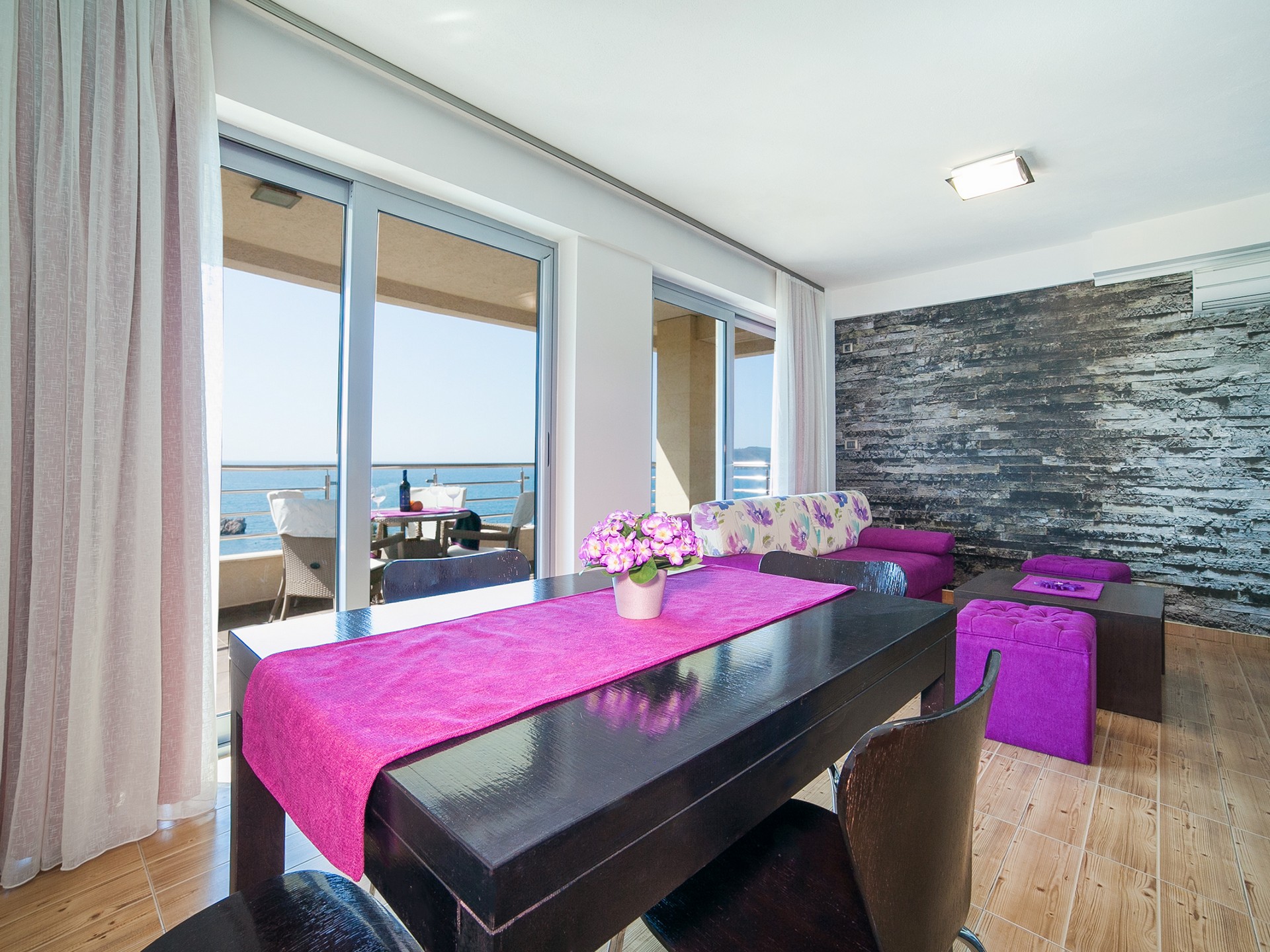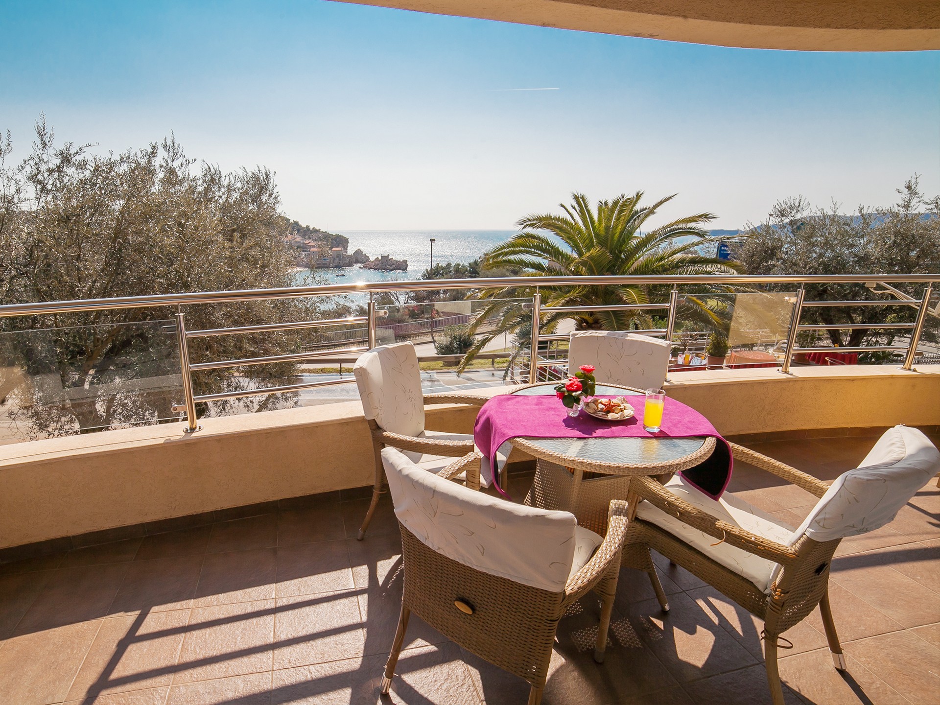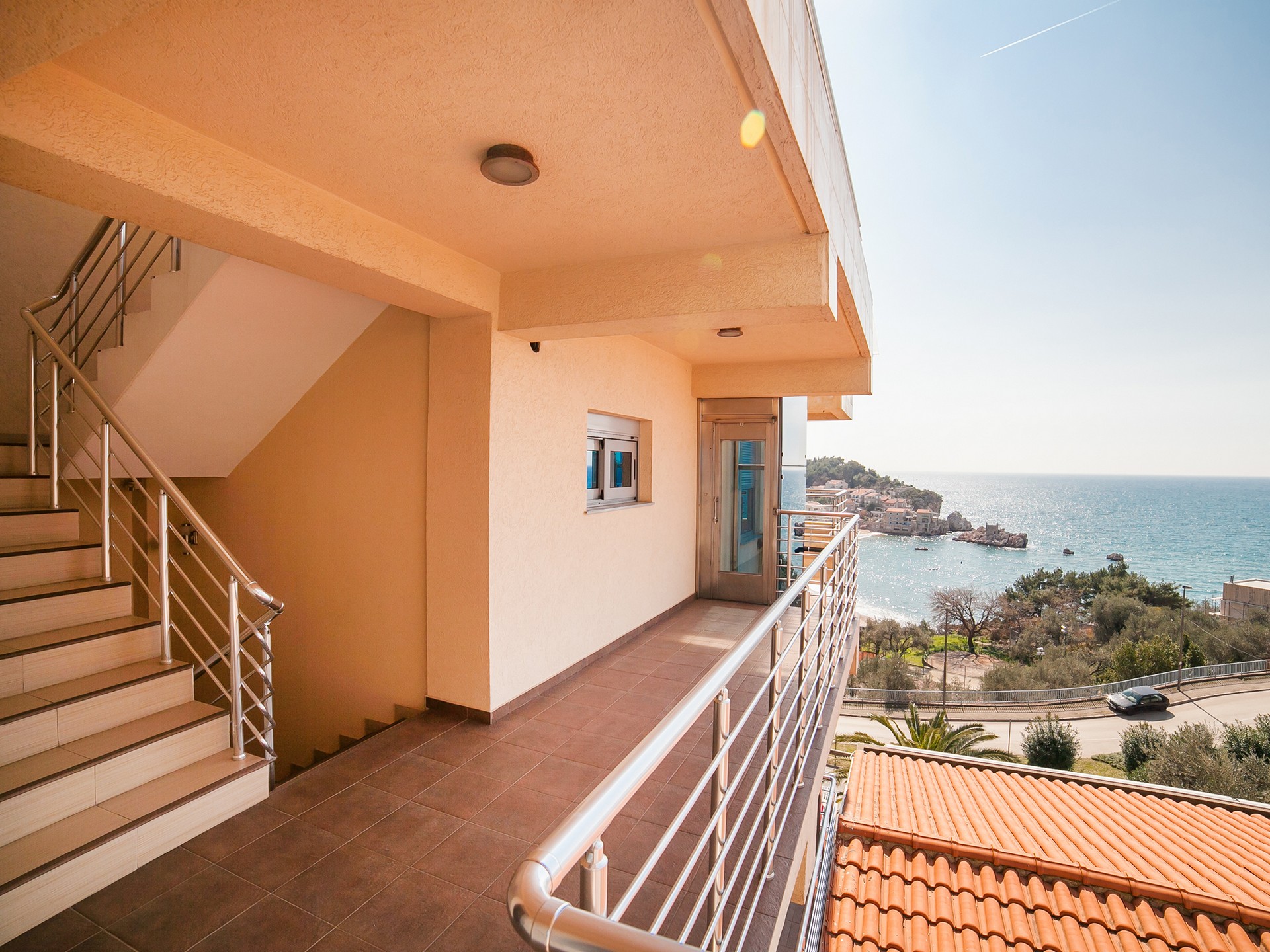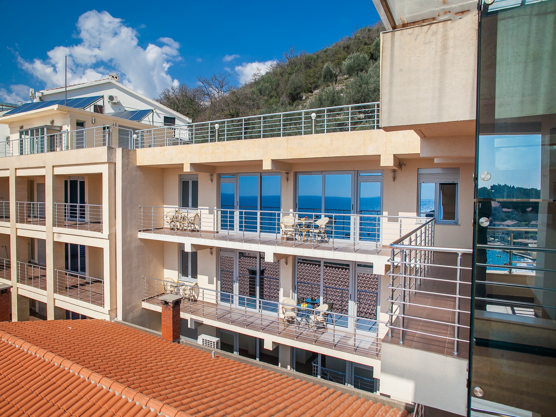 Naše terase na krovu i u prizemlju sa prekrasnim pogledom na more su savršeno mjesto za opuštanje i uživanje u ljepoti Pržna i Budvanske rivijere. S pogledom na beskrajni plavi horizont, nudi prekrasan ambijent za jutarnju kafu, nezaboravne zalaske sunca ili opuštajuće večeri pod otvorenim nebom. Takođe vam je na raspolaganju teretana svakog dana od 9:00 do 20:00 sati.