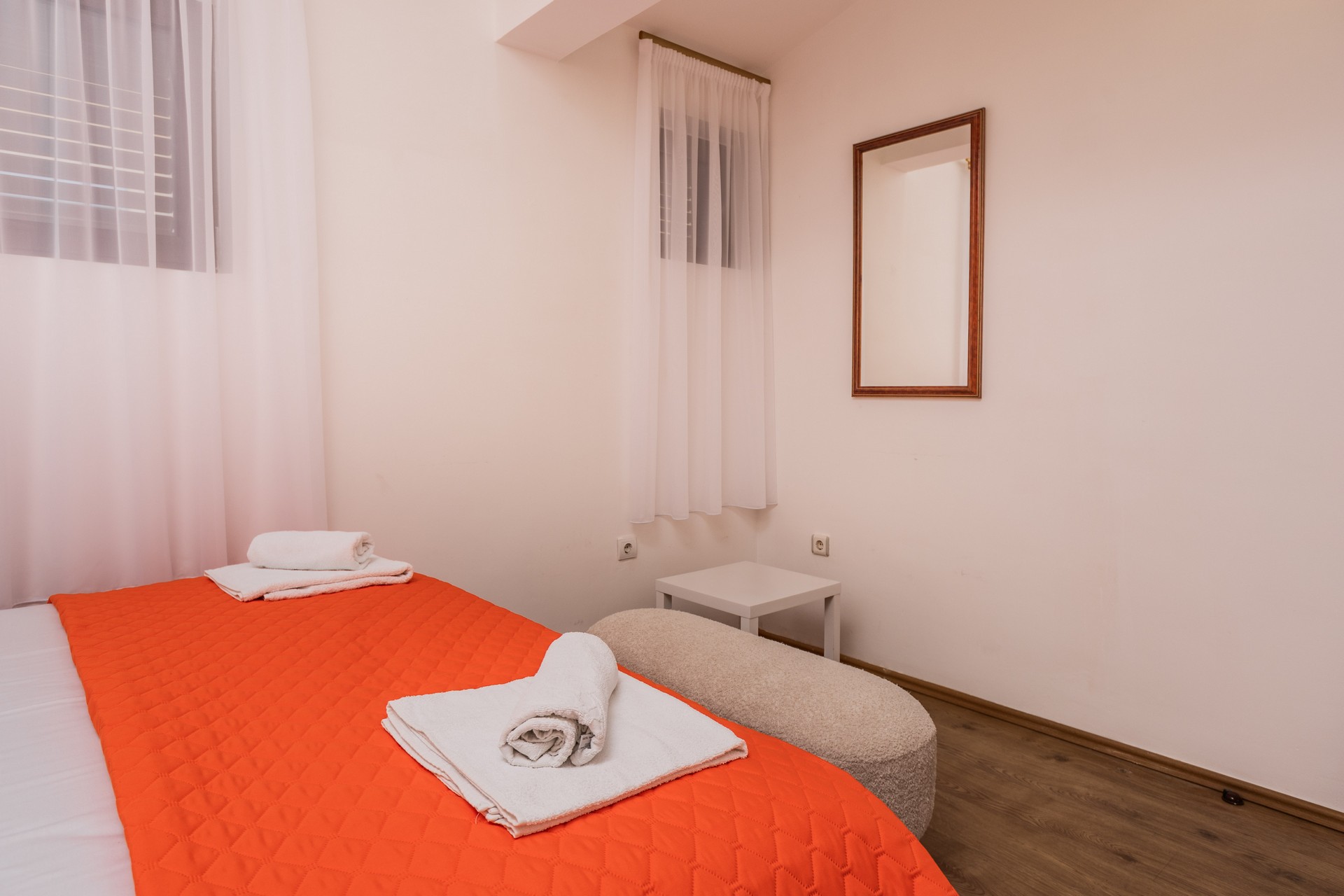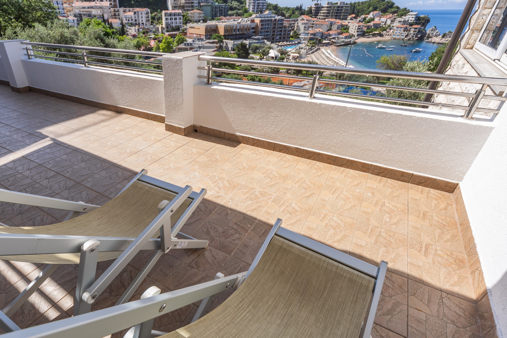 Apartman sa dvije spavaće sobe je kapaciteta za šest osoba. Nalazi se na drugom spratu. Ima balkon sa ležaljkama, stolom i stolicama sa koga se pruža predivan pogled na more. Sadrži francuski ležaj u obje sobe i dve sofe na razvlačenje u dnevnoj sobi. Kuhinja je kompletno opremljena sa trpezarijskim stolom i stolicama, pločom za kuvanje, rernom, kuvalom za vodu, mikrotalasnom pećnicom, kuhinjskim priborom i frižiderom. Kupatilo sadrži fen i veš mašinu. U jednom kupatilu je kada a u drugom je tuš kabina. Apartman je klimatizovan, a gostima su na raspolaganju internet, TV sa kablovskim kanalima, pegla / daska za peglanje i sef. Svim gostima su dostupne dvije zajedničke terase (na krovu i u prizemlju), teretana i lift. Kvadratura: 100m2.